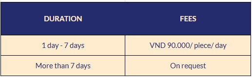 We can help arrange luggage storage for you at Noi Bai Airport’s facility. Fees (paid by customers) are charged as below: