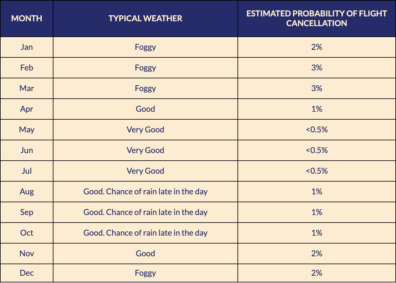 As a reference below is the typical weather situation in Northern Vietnam by month and estimates of the probability of flight cancellation: