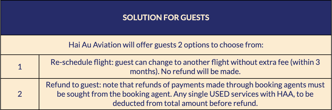 Hai Au Aviation is committed to providing passengers with safe and complete flight experiences. However, in some unavoidable circumstances, flights may be delayed, canceled, or rescheduled for safety reasons.